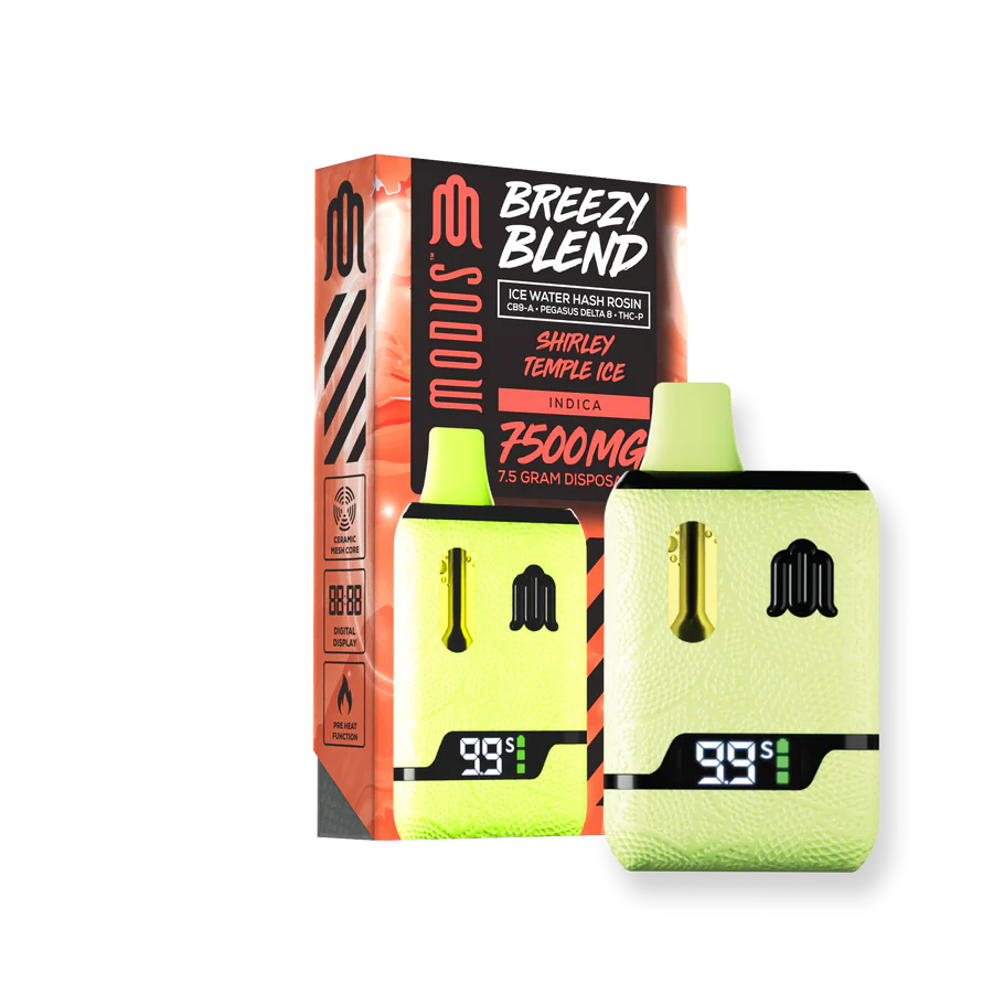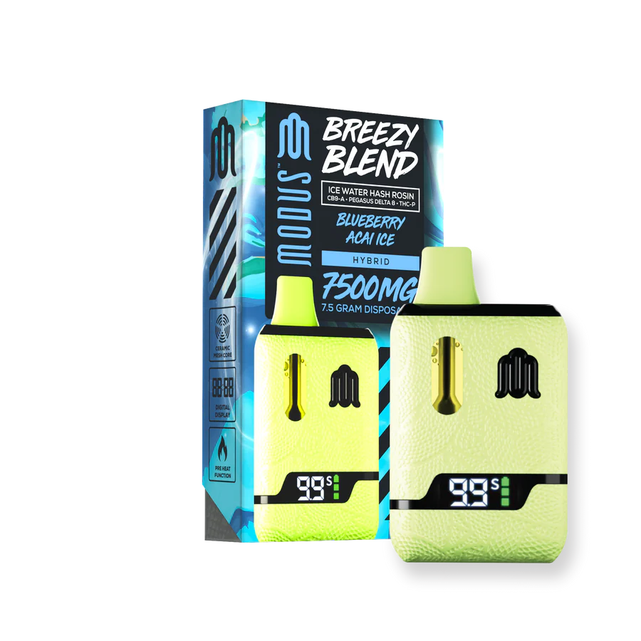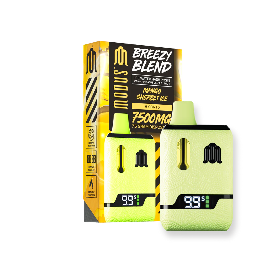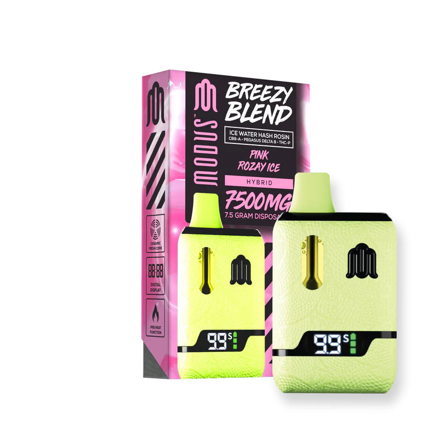 Elevate your vape with Breezy Devices Disposable 7500mg by Modus. It blends Delta 8, THC-P, and live hash rosin for smooth, flavorful hits. Plus, it comes pre-charged for instant enjoyment.
