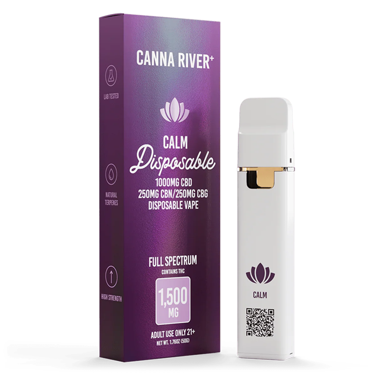 Relax anytime with the Canna River Calm Disposable Vape Full Spectrum CBD CBN CBG THC 2g. This 2-gram vape blends CBD, CBN, CBG, and trace THC to support calm, reduce stress, and ease mild aches.