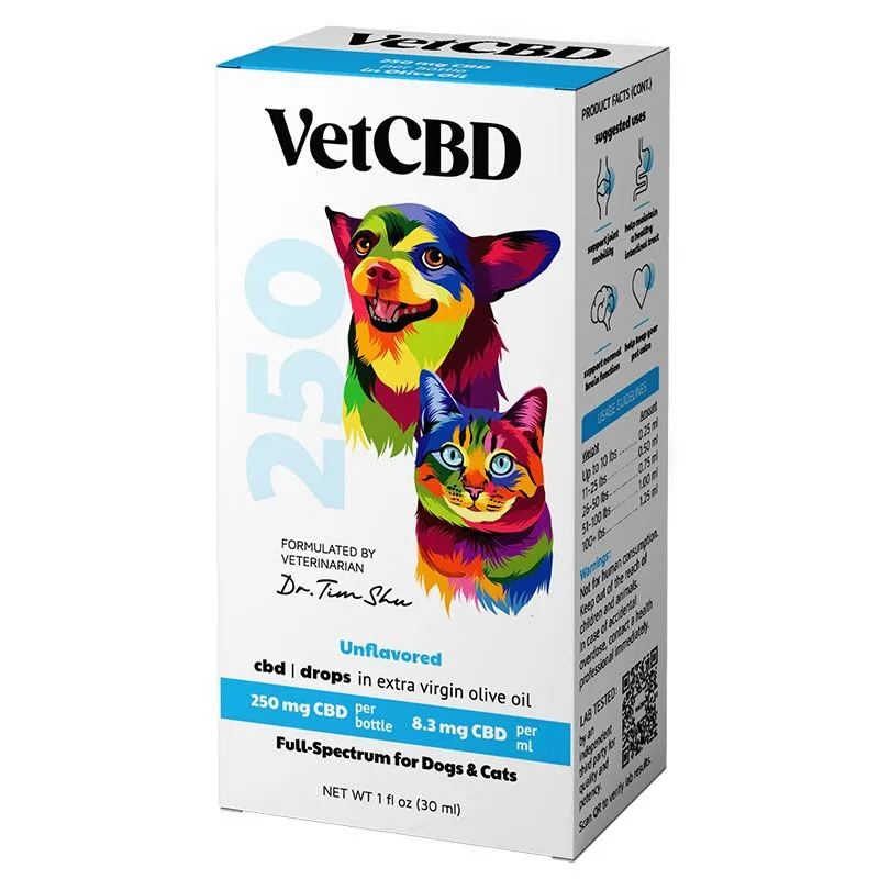 250 mg Tincture is a great starter size and for use in smaller pets, up to 25 lbs. A meticulously formulated product tailored to small pets weighing up to 25lbs. This gentle concentration of 8.3mg CBD per ml ensures a perfect fit for your furry friend. VetCBD Hemp is a carefully crafted, full-spectrum blend that offers natural support for your pet’s overall health. Whether they need calming support, enhanced mobility, or assistance with brain and GI health, our starter size bottle provides a convenient option for as-needed use.