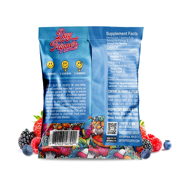 Get ready for a mind-bending adventure with DayTripper Legal Psychedelics Mushroom Gummies 3ct. Infused with a unique blend of nootropic mushrooms, Blue Lotus, and Mad Honey, these plant-based gummies offer a sensory-enhancing experience like no other. Each pack contains three delicious, brain-boosting gummies designed for those seeking a whimsical journey of self-exploration. No THC, no psilocybin – just pure, legal psychedelic-inspired fun! Get it now at Destino Farms!