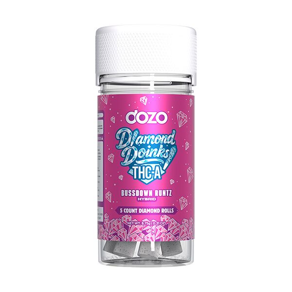 Dozo THCA Diamond Doinks 5ct Diamond-Infused Pre-Rolls deliver bold potency with a smooth, slow-burning structure. Dozo designed this lineup for experienced users who value strength, flavor, and consistency. Each jar of Dozo THCA Pre-Rolls includes five diamond-infused joints with a total weight of 8.75 grams.