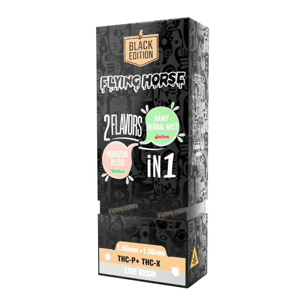 The Flying Horse Black Edition 2in1 Disposable Rainy Herbal Mist Horizon Bliss 3.8 offers two live resin strains in one sleek vape. Switch between the refreshing herbal mist and dreamy indica bliss anytime.