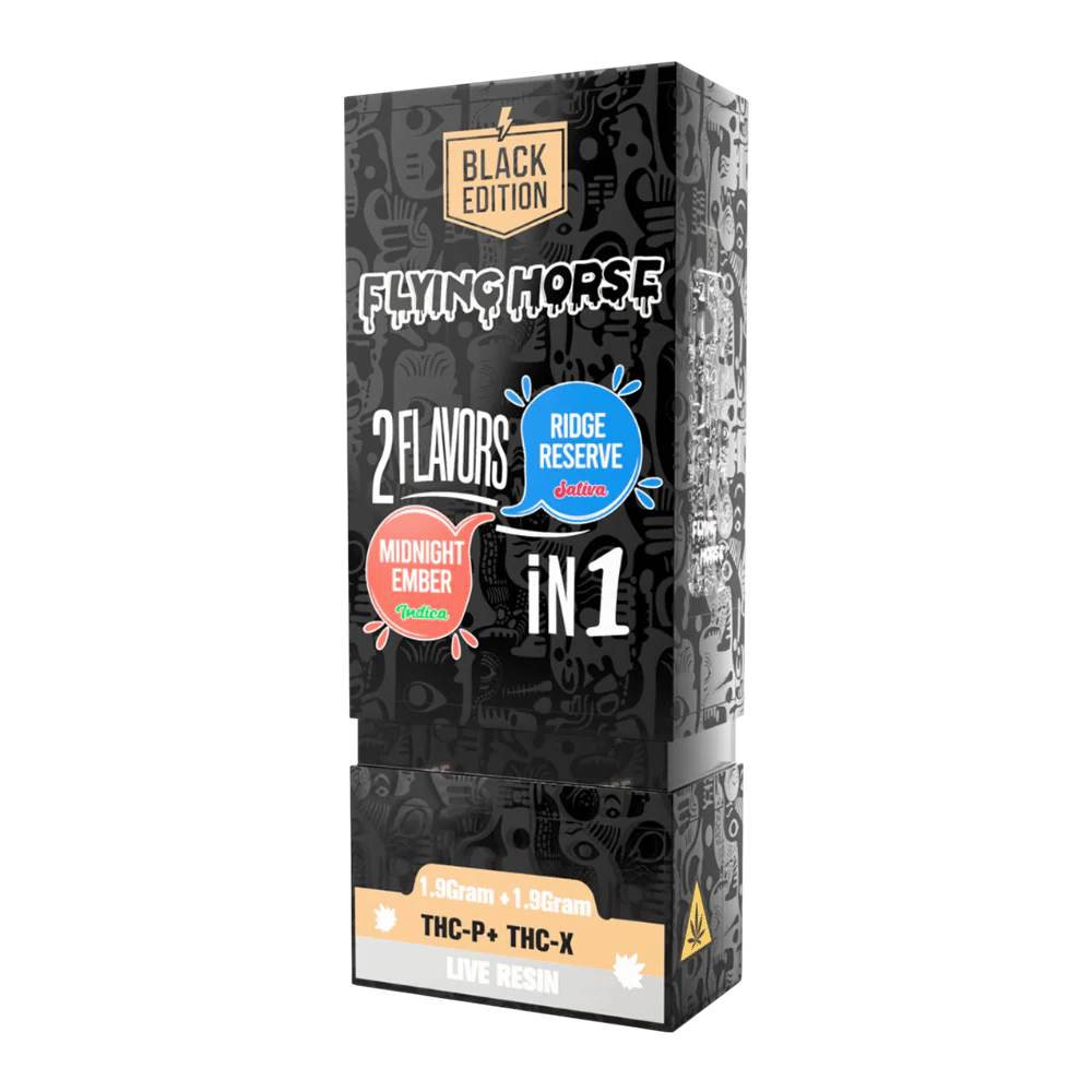 Experience bold flavor and deep calm with Flying Horse Black Edition 2in1 Disposable Ridge Reserve Midnight Ember 3.8. Switch strains anytime, enjoy smooth live resin hits, and recharge quickly.