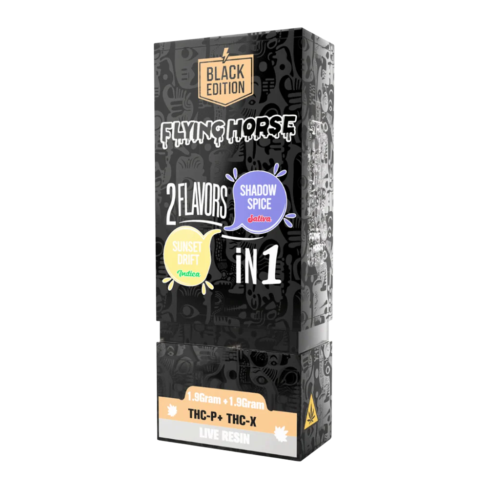 Turn every vape session into an experience with the Flying Horse Black Edition 2in1 Disposable Shadow Spice Sunset Drift 3.8. This premium dual-chamber device lets you enjoy two distinct live resin strains with just a quick switch.