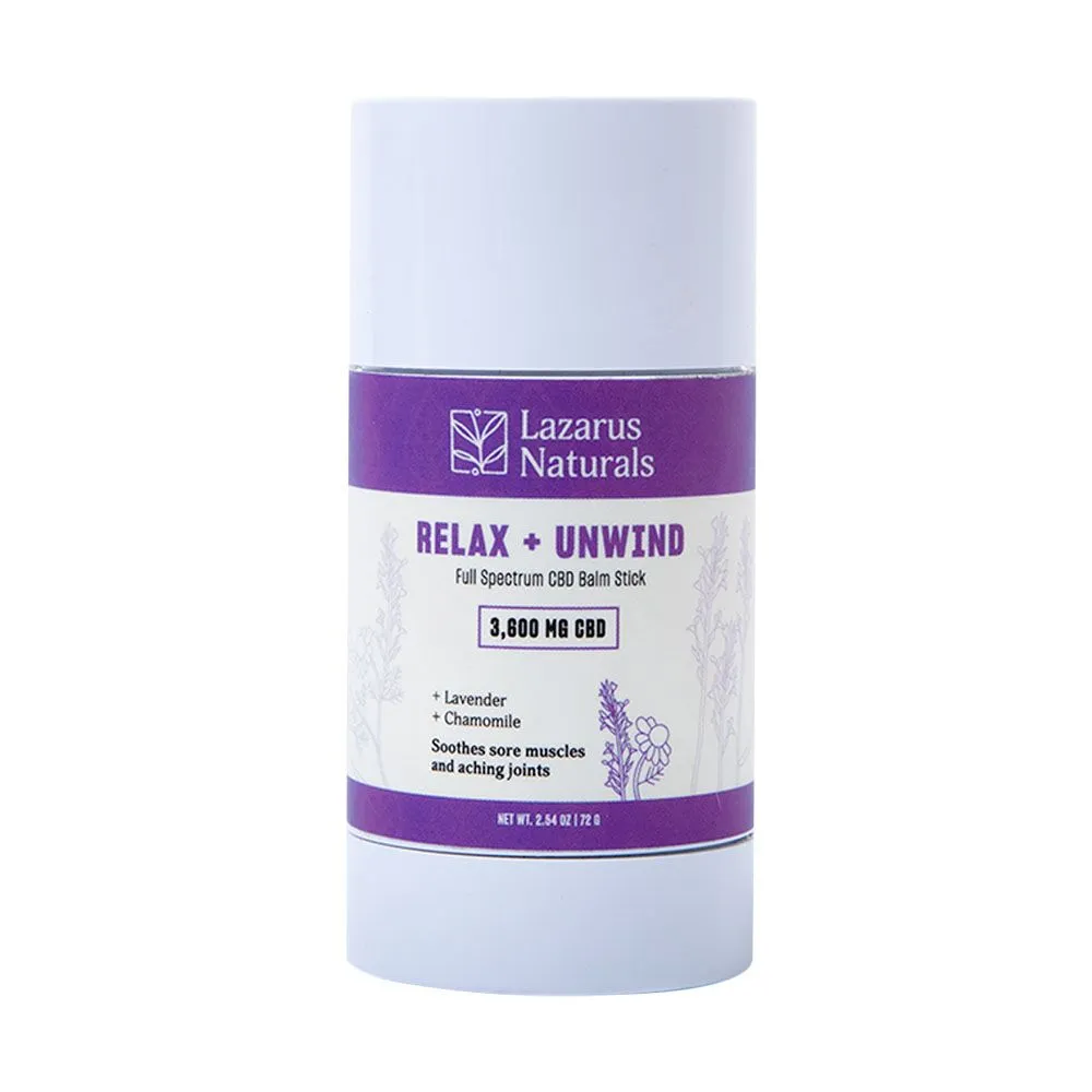 Find comfort and deep, long-lasting muscle relief with a simple swipe of Lazarus Naturals Relax + Unwind CBD Balm Stick. Lazarus Naturals’ potent formula of full spectrum hemp extract is paired with a calming blend of lavender and chamomile to help tame soreness and stress. Lanolin, beeswax, and jojoba oil work together to gently nourish and soothe the skin while our powerful, hemp-derived full spectrum CBD delivers sustained relief for localized muscle pain, inflammation, and tension before, during, and after long physical days. With its smooth, direct application the Relax + Unwind CBD Balm Stick helps you avoid messy hands and focus on the deep relief your body needs, when and where you need it.