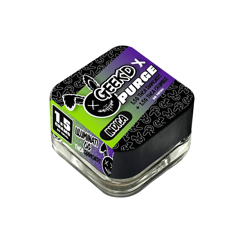 The Geek’d x Purge THCa Diamonds Crumble 3G Illuminati OG Strawberry Cheesecake Indica offers sweet flavor and deep calm. Enjoy earthy pine and berry notes. Transition easily into full relaxation with this premium indica concentrate.