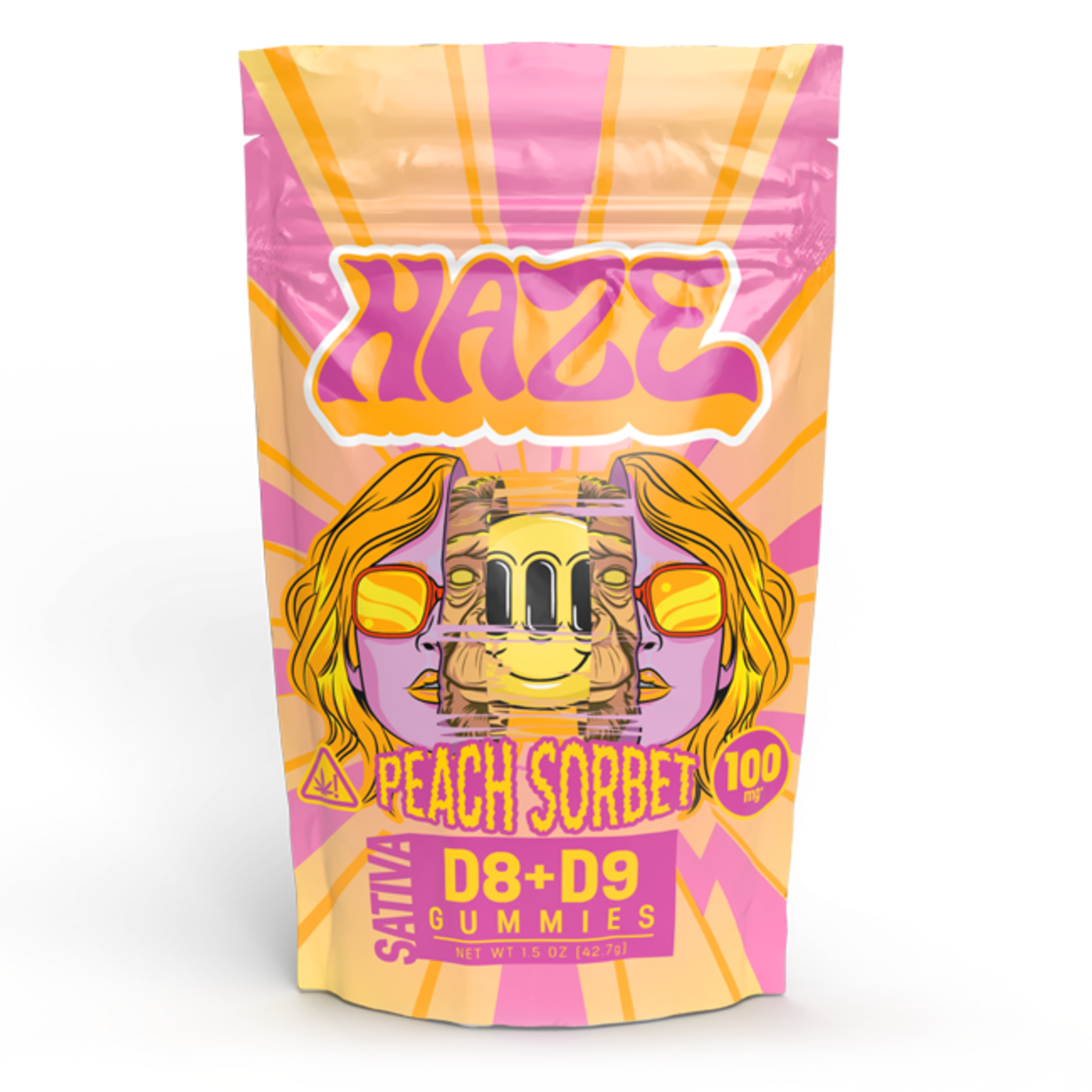 Haze D8 D9 Gummies 100mg Peach Sorbet Sativa 8CT offer an uplifting experience. Enjoy a refreshing peach sorbet flavor and boost your focus. Perfect for creative work or social sessions.