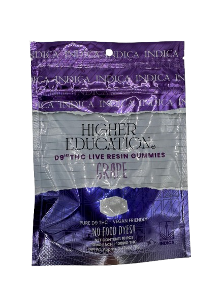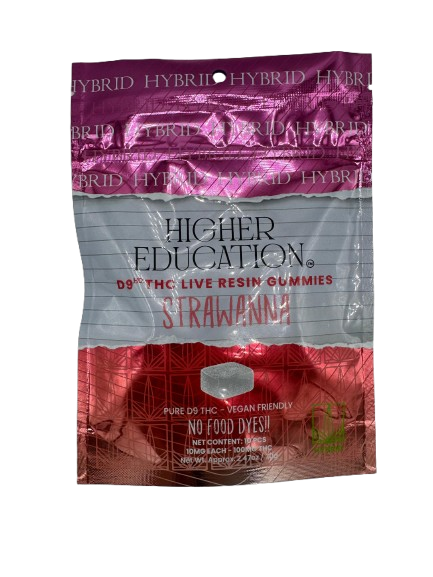 Experience the next level of premium edibles with Higher Education D9 Live Resin Gummies. Each gummy delivers 10mg of Delta 9 THC, offering a consistent and enjoyable edible experience with bold flavor and strong effects. Every bag includes 10 gummies for a total of 100mg Delta 9 THC per package.