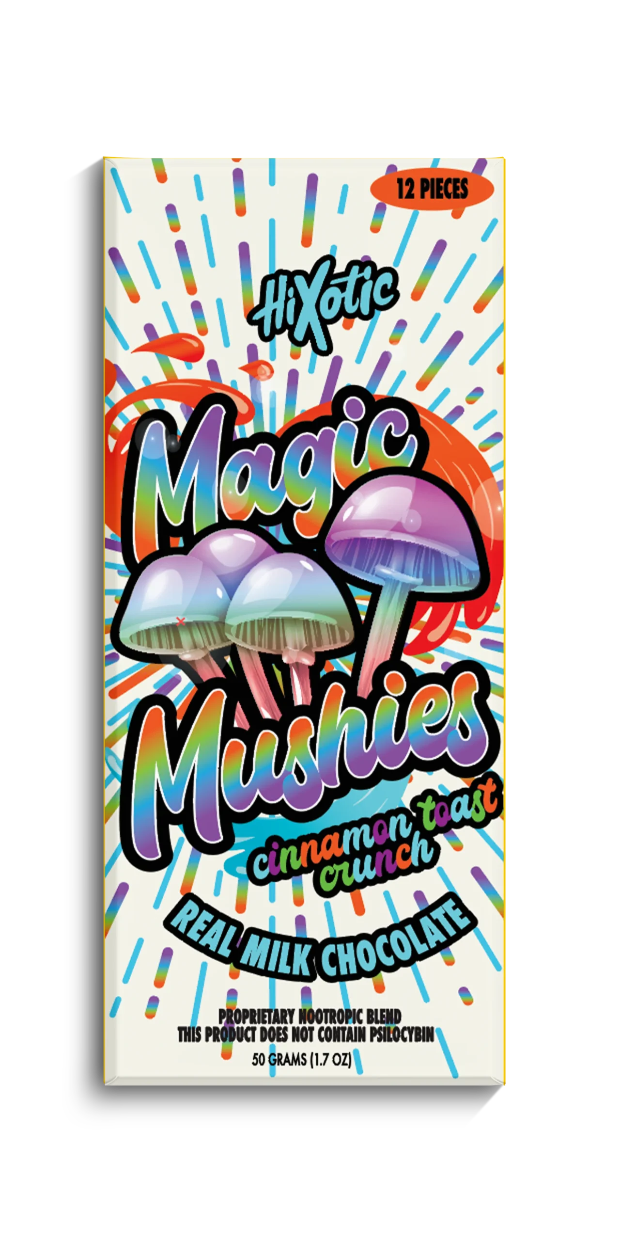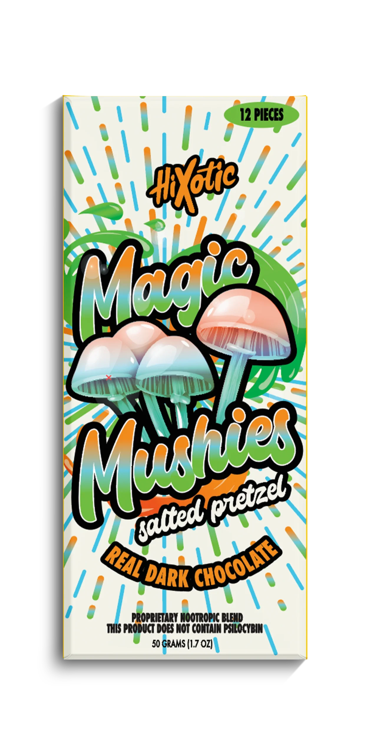 The HiXotic Magic Mushies Nootropic Blend Chocolate Bars mix rich vegan chocolate with a potent nootropic blend. Each bar offers 12 pieces at just 20 calories each. Moreover, you can choose from Cinnamon Toast Crunch, Cookies and Cream, or Salted Pretzel.