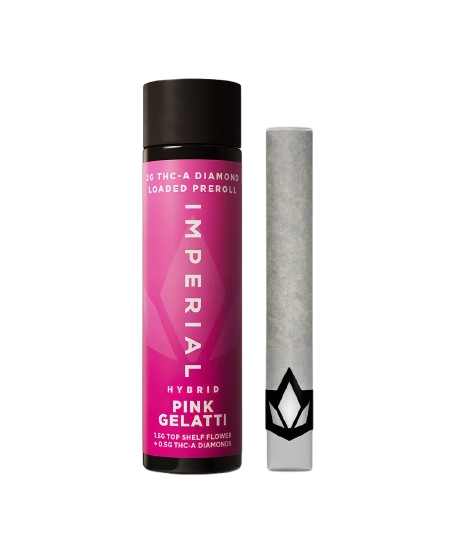 Imperial Pink Gelatti THCA Diamond Loaded Preroll is a premium 2‑gram product combining 1.5 grams of top‑shelf flower with 0.5 grams of THCA diamonds to deliver enhanced potency and flavor. This hybrid strain blends the sweetest traits of Gelato and Pink Biscotti for a balanced experience that uplifts the mind while gently relaxing the body.