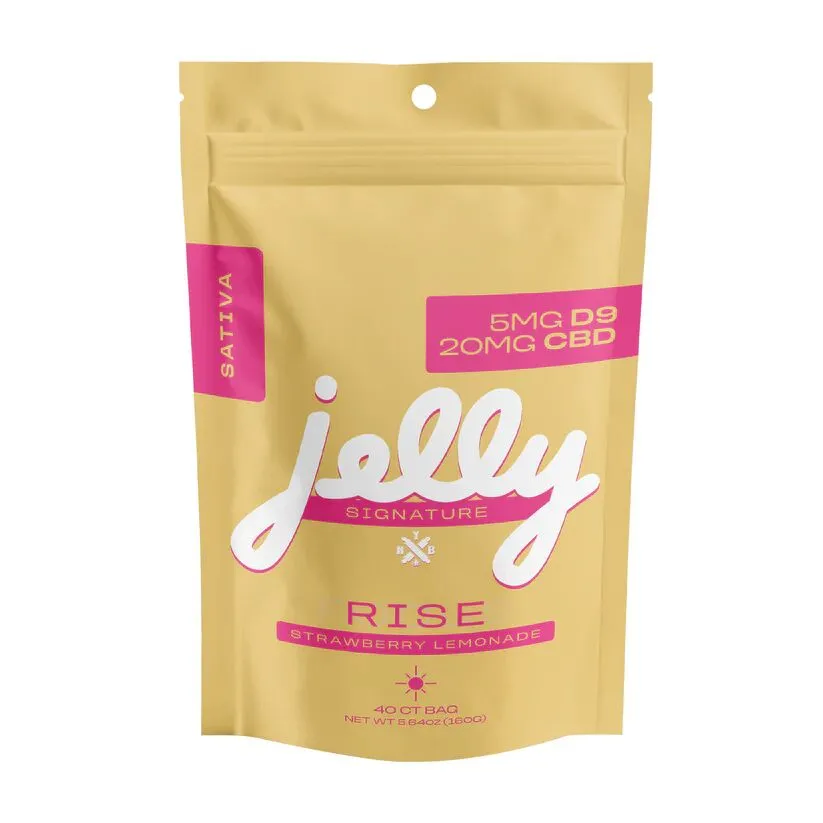 Unwind with Jelly Signature Rise Strawberry Lemonade Delta-9 CBD Gummies—each piece blends 5mg Delta-9 THC and 20mg CBD for smooth, balanced relaxation anytime you need it.