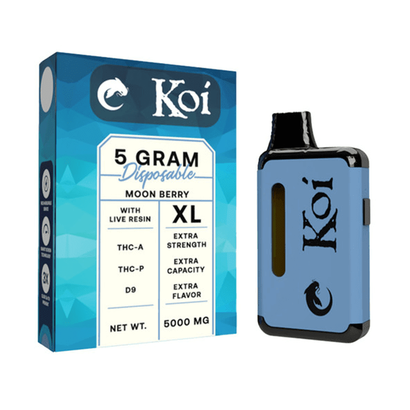 Koi CBD Live Resin THCA/THC-P/D9 Vapes 5g deliver five grams of terpene-rich, flavorful vape juice. Packed with THC-A, THC-P, and delta 9 THC, these disposable, rechargeable vapes create a swirl of energizing psychoactive effects. You can enjoy an ideal midday boost or a smooth nighttime unwind.