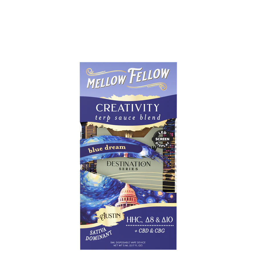 Let your ideas take flight with the Mellow Fellow Creativity Blend Terp Sauce 5ml Disposable Vape Blue Dream Sativa. This blend is your go-to when you’re ready to overcome creative blocks and tap into inspiration. Crafted with a powerful mix of HHC, Delta-8, CBD, CBG, and Delta-10, this vape delivers a smooth, cerebral buzz that encourages out-of-the-box thinking.