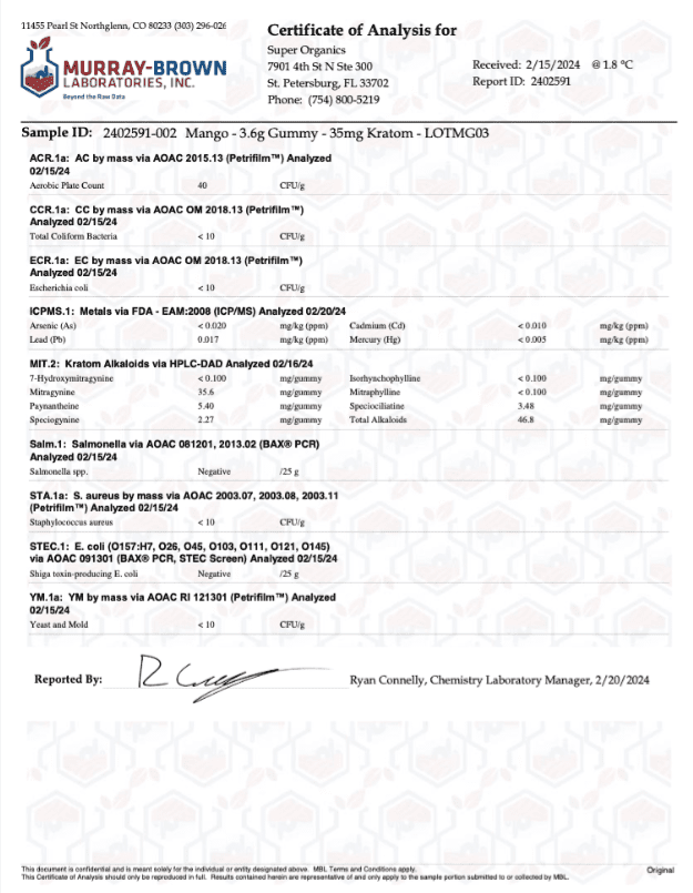 - 35mg of mitragynine per gummy – equivalent to 2.33 grams of kratom powder at a 1.5% mitragynine level.